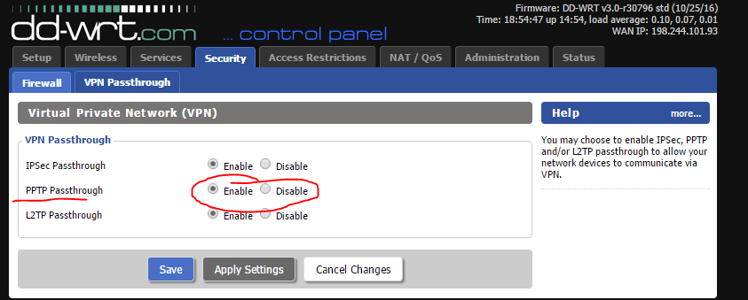 – Make sure In DDWRT you allow PPTP passthrough (Inside of Security > VPN Passthrough)