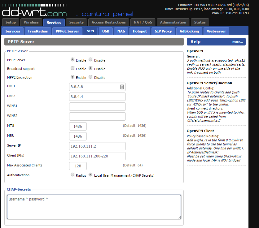 Note: PPTP is not secure, and I suggest you to use OpenVPN. However, for this case the hardware I was using only supported PPTP.