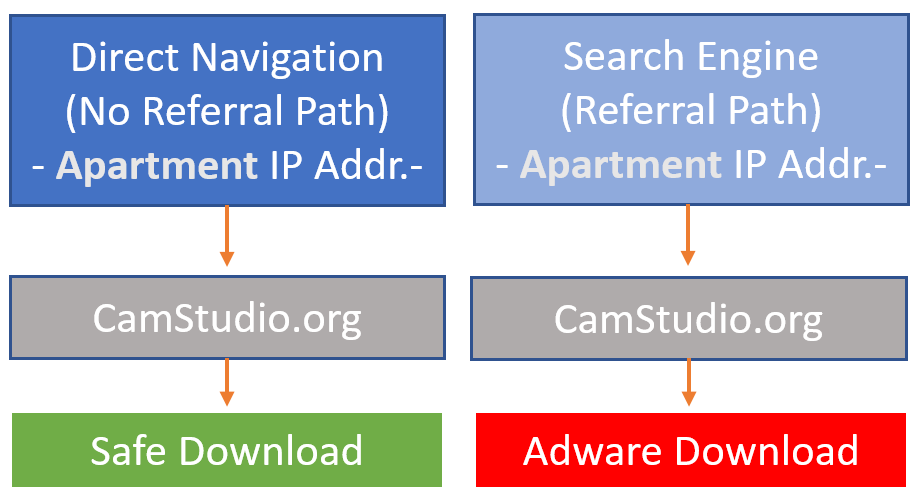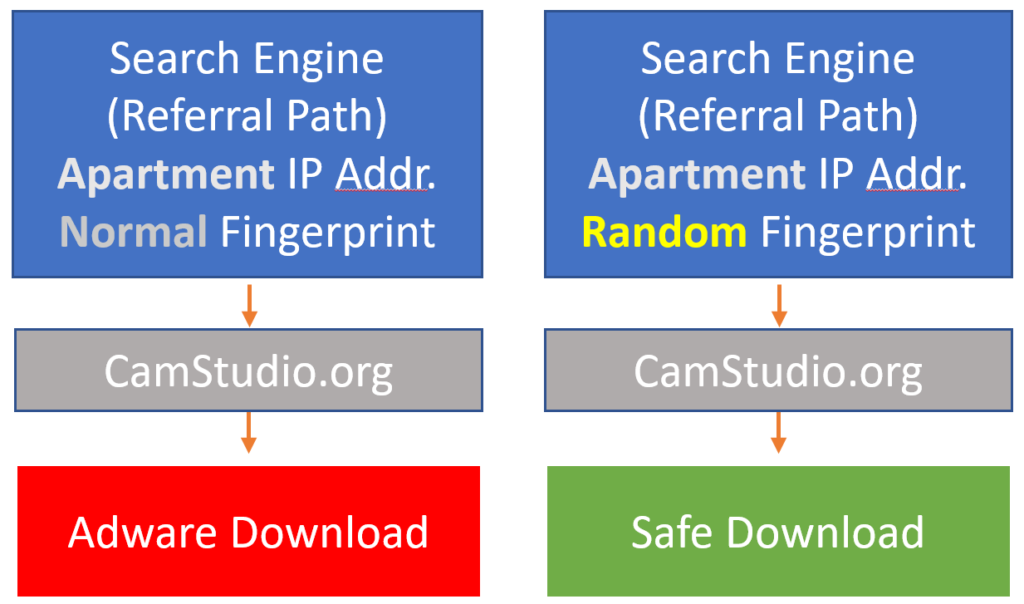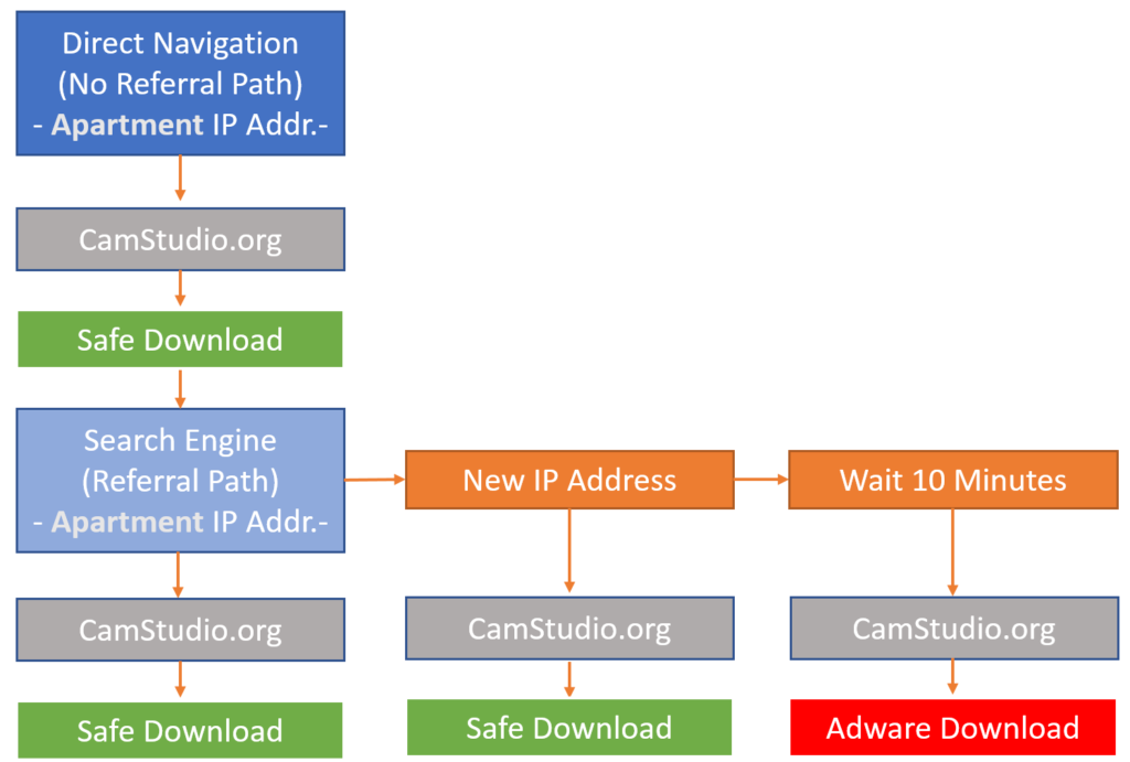 This is when it starts to get interesting, depending on how the scanning occurs (order of the steps). Or if a manual search visit is performed AND the browser is similar to the initial visitor’s browser who went directly they would still get the Safe download instead of Adware.