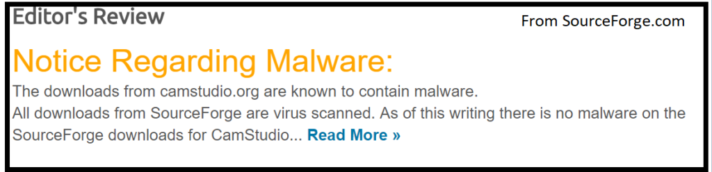 This website is so widely known to contain Adware that the second search result for “camstudio” (SourceForge.com) even has a warning about CamStudio.org containing malware.